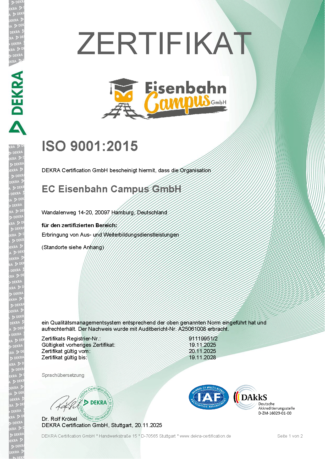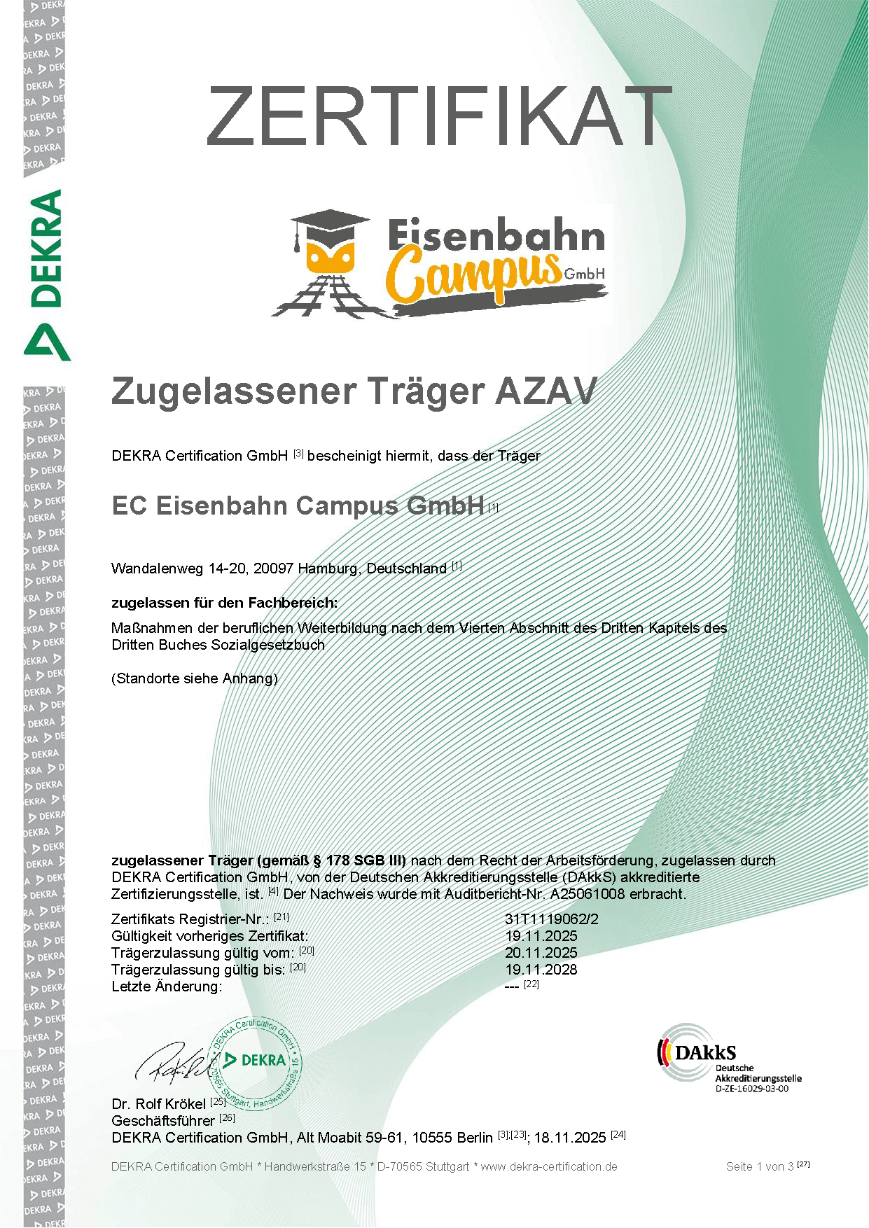 Wir, der Eisenbahn Campus, sind von dem Eisenbahnbundesamt (EBA) als Stelle für die Ausbildung und Prüfung nach der Triebfahrzeugführerscheinverordnung (TfV) zugelassen.